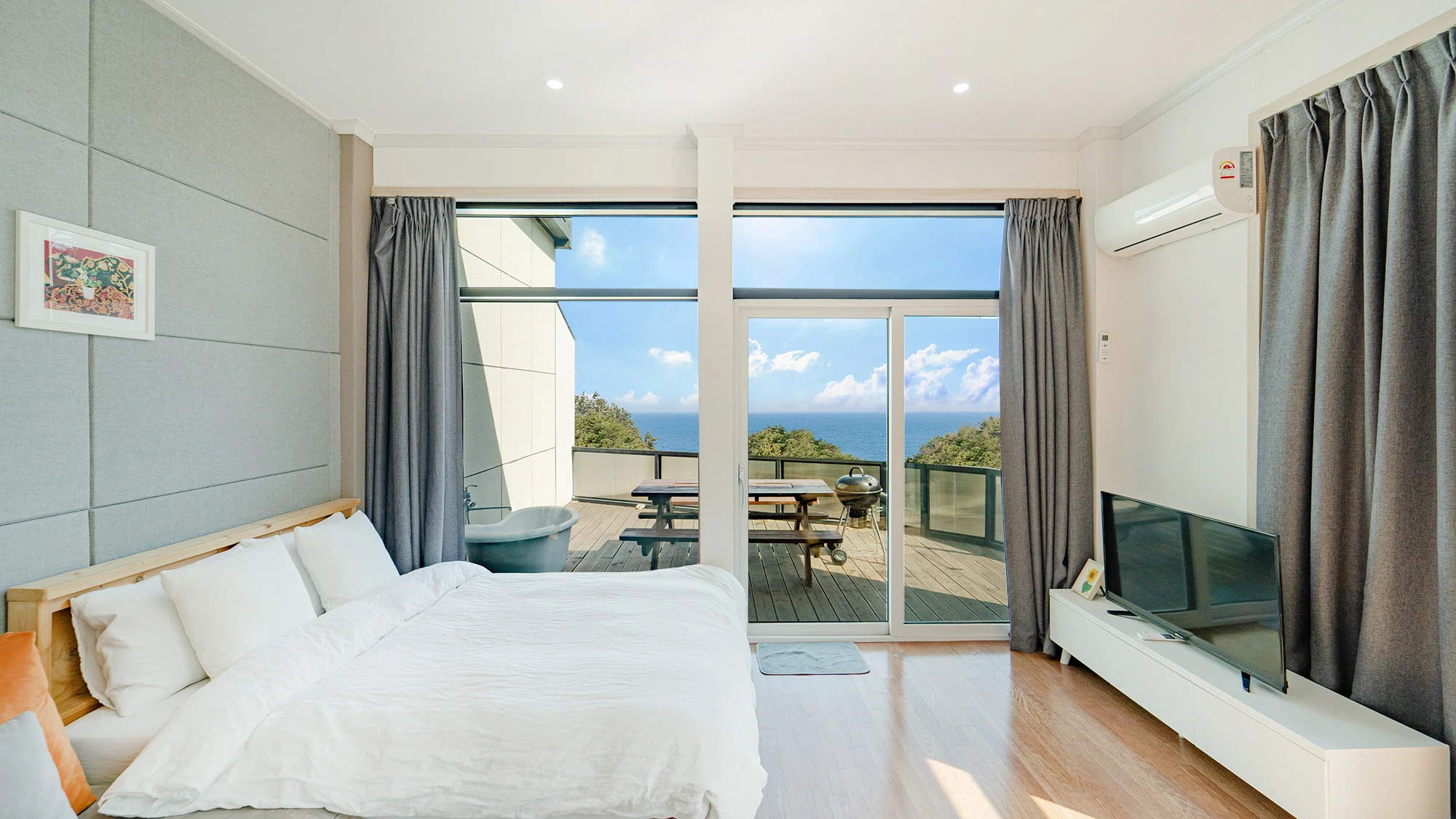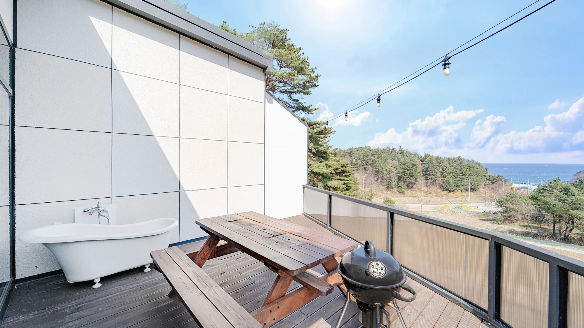- 집기품목 : TV, 냉장고, 에어컨, 인덕션, 취사시설/도구, 샴푸, 린스, 바디워시, 비누, 타월, 드라이기, 와이파이, 금연, 개별바비큐, 테라스, 욕실용품, 전자레인지, 바다전망